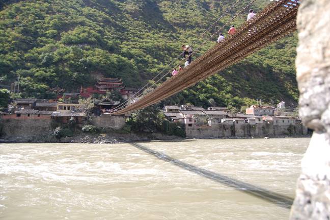 赫赫有名的紅軍飛奪瀘定橋就在這里,橋下是水流湍急的大渡河,紅軍由西向東渡河。(見下圖)