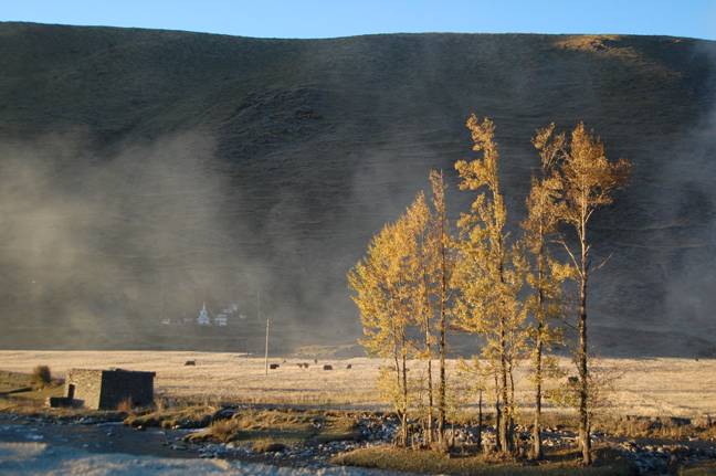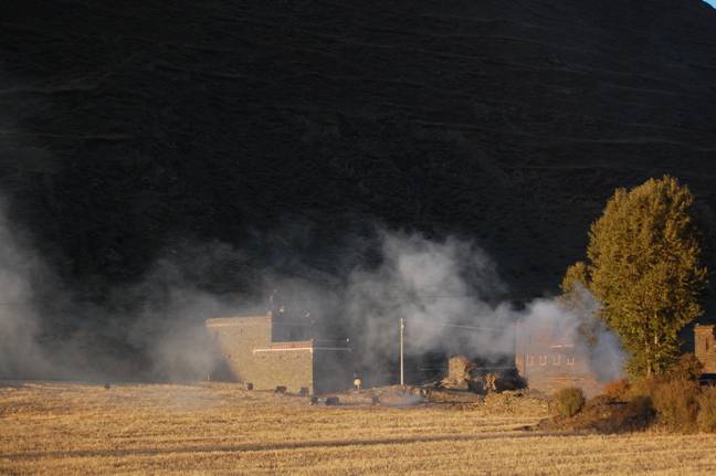 翻過山口后,逐漸進(jìn)入號稱“中國攝影之都”的新都橋鎮(zhèn)地域。正值晚膳時間,遠(yuǎn)處暮色西沉、炊煙裊裊、流水潺潺,田野秋實金黃、牛羊倦歸,光、影、色、人、物確實是一派極品的農(nóng)牧景致!若非修路造成塵土飛揚,一定要下車駕上相機(jī),踟躕不肯前行了。(見下圖)