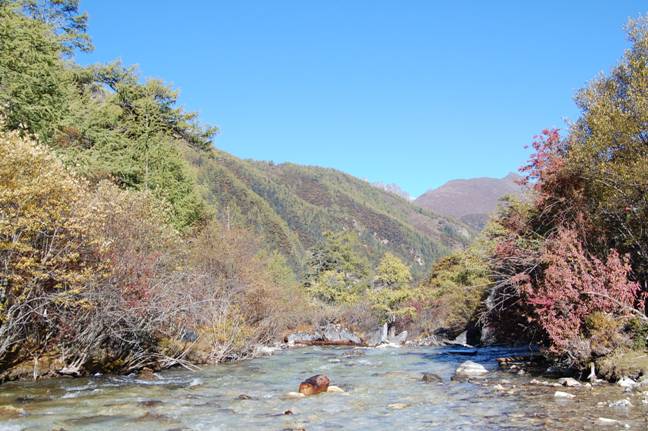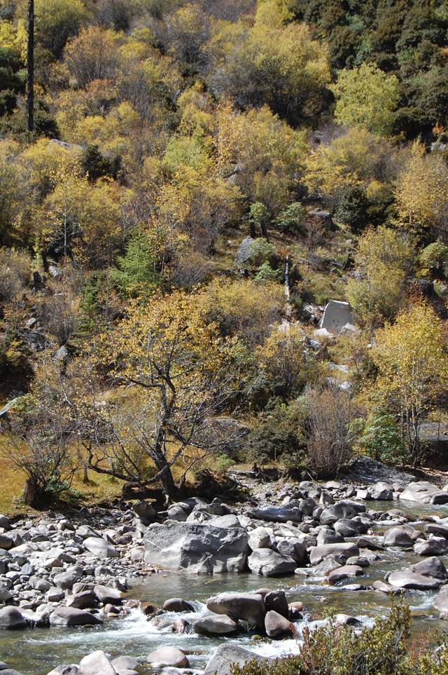 以下紅黃綠間雜的落葉喬木森林,景色賞心悅目。
