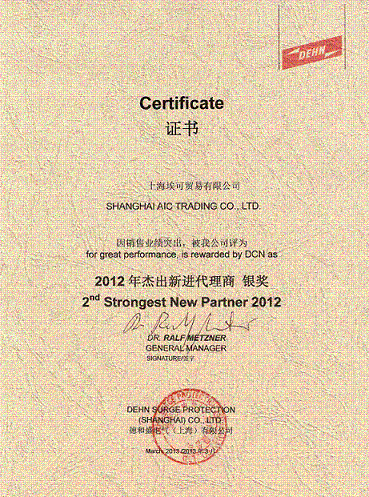 DEHN(德和盛電器上海有限公司)授予我司(上海埃可貿(mào)易有限公司)2012年杰出新進(jìn)代理商獎(jiǎng)